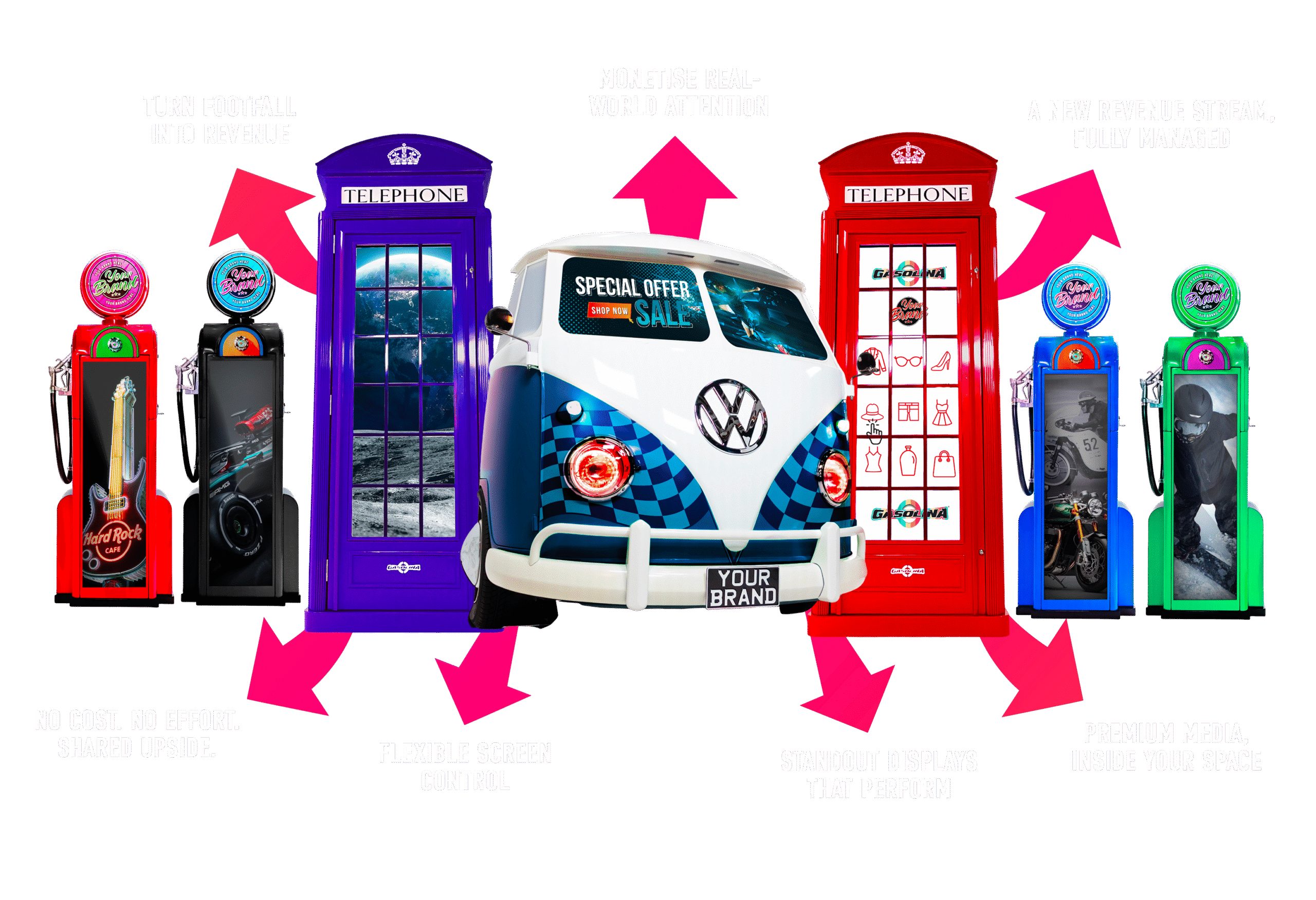 Gasolina installs bold, eye-catching digital displays designed for captive environments. We operate and monetise them through premium programmatic advertising, generating shared revenue at no cost to you.